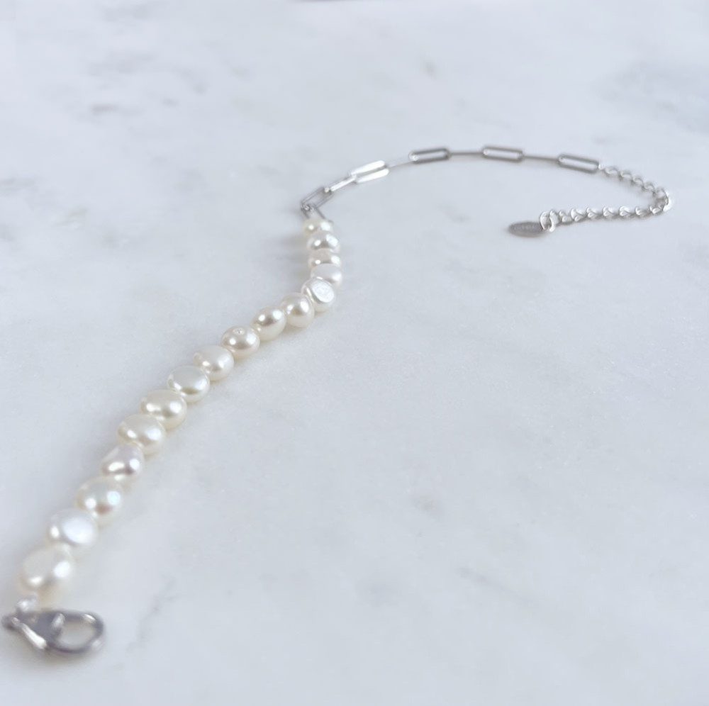 Sterling ezüst karlánc édesvízi gyöngyökkel kombinálva. Látványos és finom ékszer. Önmagában vagy más karkötőkkel kombinálva, viseld hangulatod szerint.