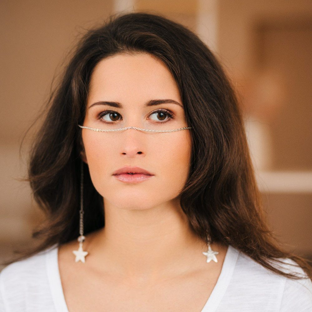 Az arclánc az orrnyeregnél indulva a fül mögé lehajtható. Nyakláncként is hordható, vagy hajdíszként hajba tűzhető. Variáld kedved szerint, mutasd meg saját, egyéni stílusodat!