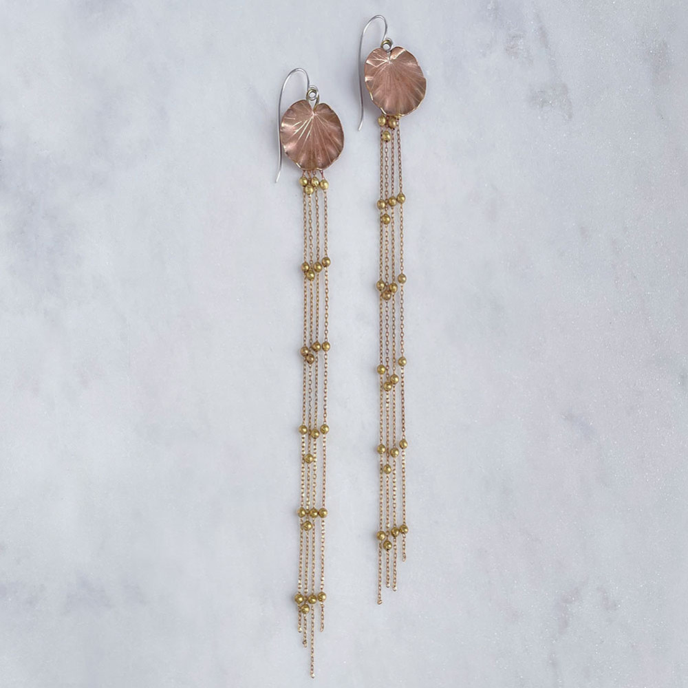 Megkapó szépségű tavirózsa levél, különösen hosszú rézcseppes lánccal. Látványos ékszer.