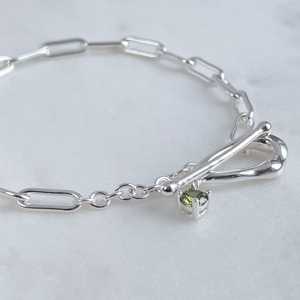 Lariát karkötő szabálytalan, művészi bújtatóval és olajzöld cirkónia kristály függesztékkel. Viselheted bármihez, de legjobban farmer, fehér ing összeállításhoz illik.
